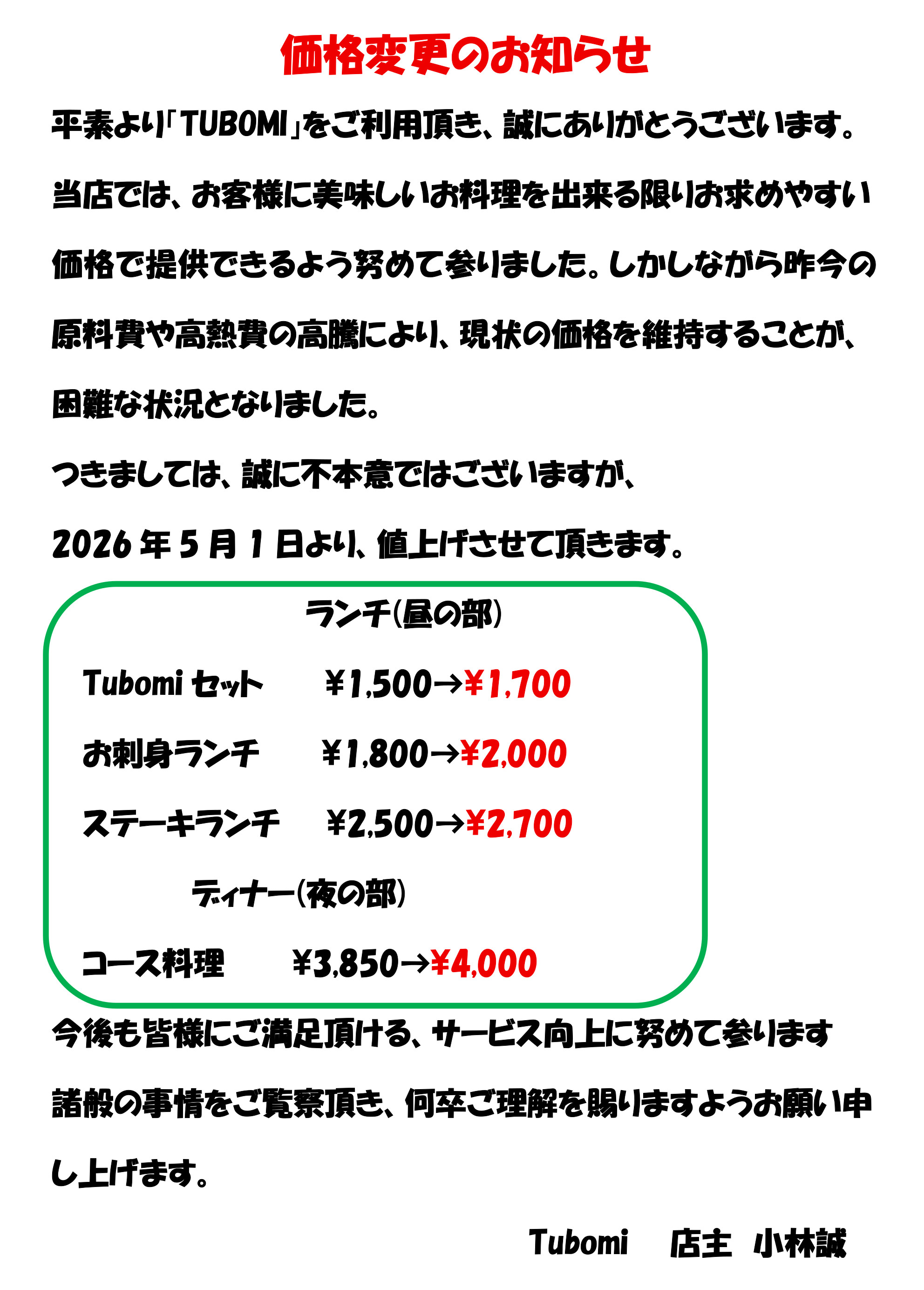 - 2025年1月1日から営業時間、ランチ価格変更となります。